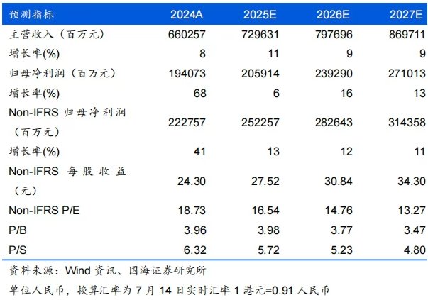 国海证券分析师陈梦竹预计腾讯2025Q2实现营业收入1796亿元(YoY+11%),NON-IFRS经营利润672亿元,同比增长15%;NON-IFRS归母净利润630亿元,同比增长10%;NON-IFRS经营利润率37%(YoY+1.1%)、NON-IFRS归母净利率35%(YoY-0.5%)。
